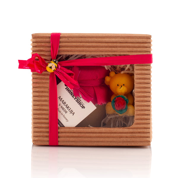 OBSAH BALÍČKA: Medová mňamka marakuja 120g (zloženie: med 97 %, marakuja 3 %), sviečka zo včelieho vosku 7g