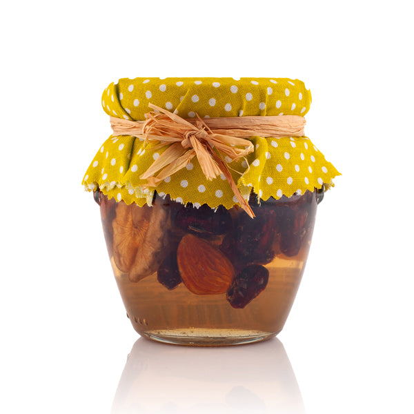 ZLOŽENIE: agátový med, sušené brusnice (brusnice, trstinový cukor, slnečnicový olej) 12,5%, mandle 4,2%, lieskovce 4,2%, vlašské orechy 4,2%