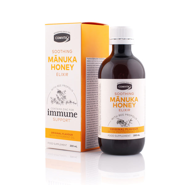 Propolisový elixír s manukovým medom a bylinkami spoločnosť Comvita vytvorila na účinnú podporu zdravia a utíšenie podráždeného hrdla.